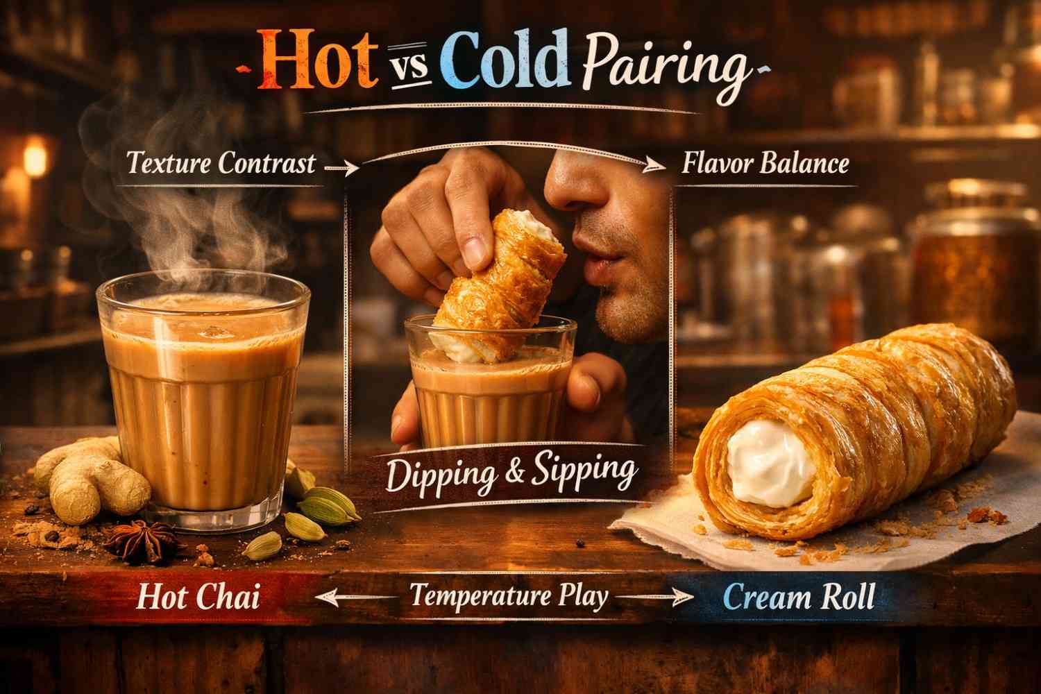 So what makes it pair so well with chai? The answer is contrast. The cream roll is cold, sweet, and soft. A cup of chai is hot, slightly sweet from milk, and carries a warmth built from spice. When you bite into the flaky pastry and cold cream hits your tongue just as you take a sip of hot tea, your brain registers a temperature and texture contrast that is genuinely satisfying. The cream also coats the palate and softens the tannins in the tea.