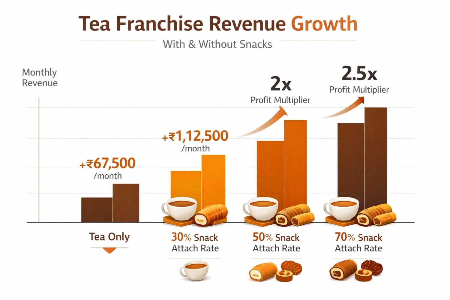 Let's look at a straightforward example. According to industry data (2025), a standard tea franchise outlet selling around 300 cups per day at Rs. 15 average generates approximately Rs. 1.35 lakh in monthly tea revenue. Now add snacks.