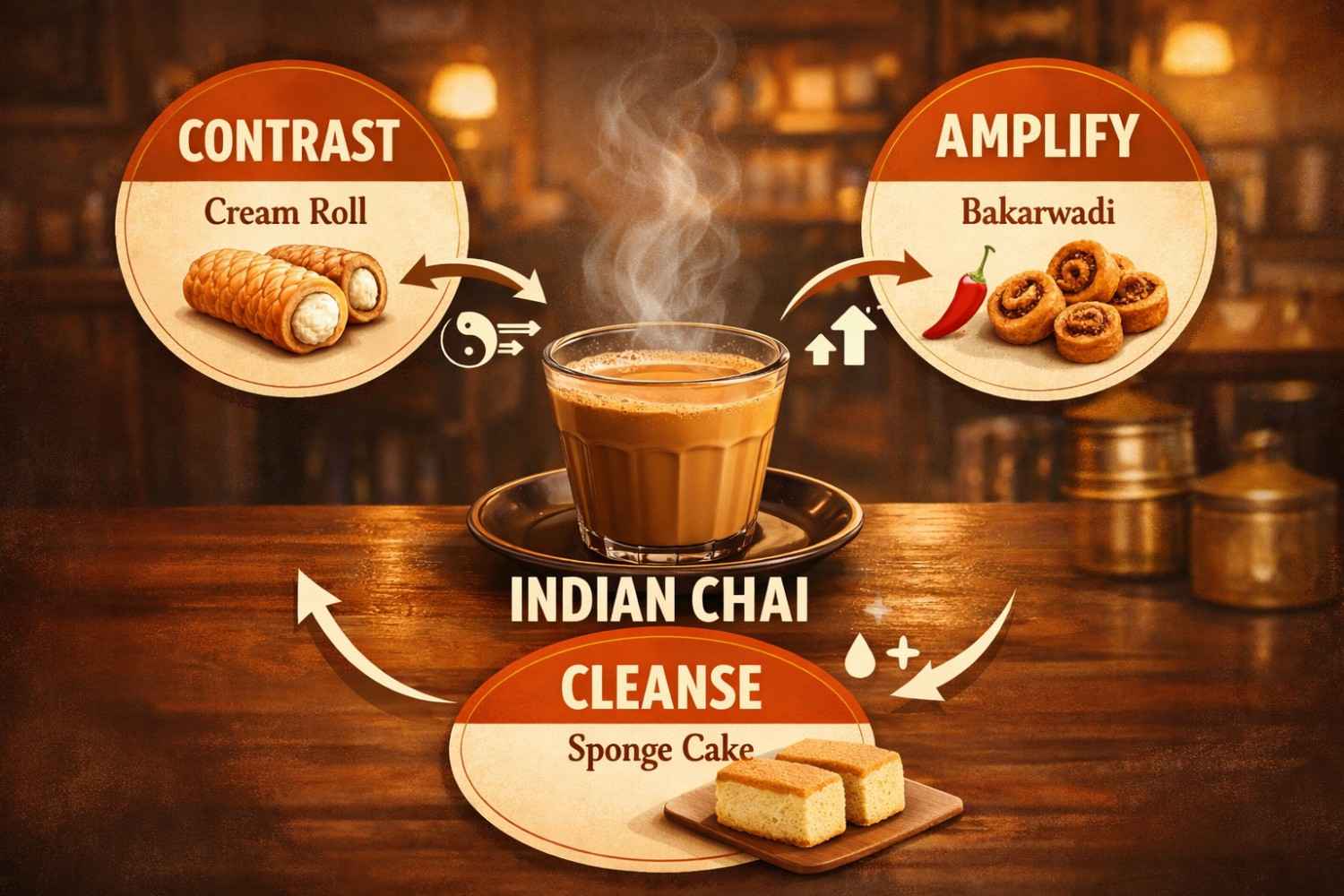 • Amplifies: spicy bakarwadi plus strong chai creates a flavor cycle that keeps pulling you back for another sip